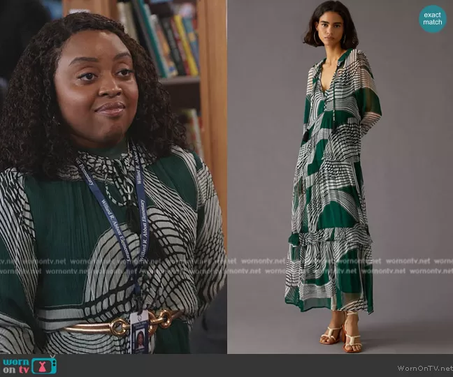 Janine Teagues (played by Quinta Brunson) on Abbott Elementary on ABC was spotted wearing this green pleated tie neck dress on Abbott Elementary on episode 'Read-A-Thon' (2x11) in Jan 2023. Janine's Dress is the The Marais Printed Chiffon Maxi Dress by Anthropologie.