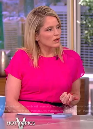 Sara Haines on The View on ABC was spotted wearing this pink contrast ruffle dress on The View on Jan 05 2023's episode. Sara's Dress is the Lattice Ruffle Crinkle Chiffon Midi Day Dress by Jason Wu.