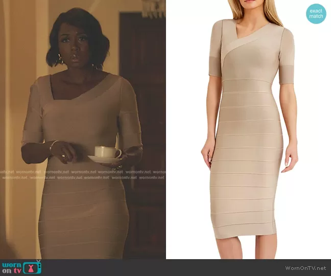 Camille de Haan (played by Amanda Warren) on Gossip Girl on HBO Max was spotted wearing this beige asymmetric neck dress on Gossip Girl on episode 'Dress Me Up! Dress Me Down' (2x07) in Jan 2023. 's Dress is the Icon Asymmetrical Body-Con Midi-Dress by Herve Leger.