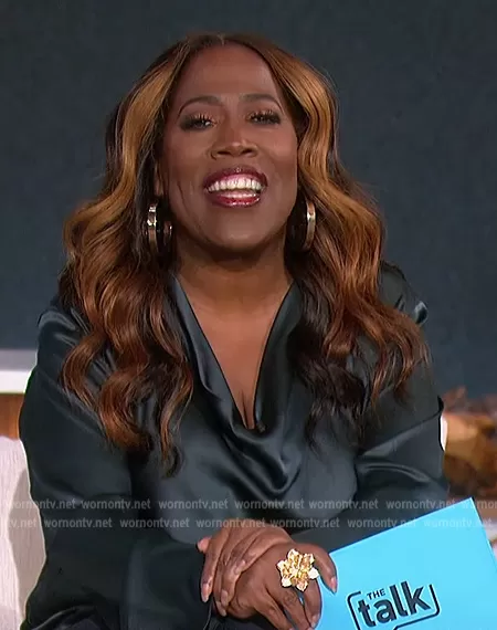 Sheryl Underwood on The Talk on CBS was spotted wearing this satin cowl neck blouse on The Talk on Jan 06 2023's episode. Sheryl's Top is the Cowl Neck Silk Blouse by Vince.