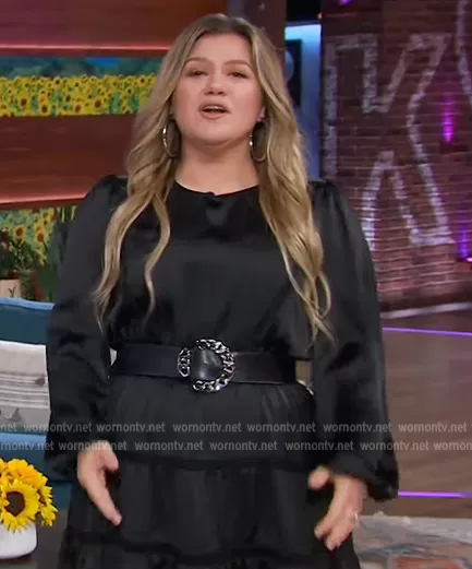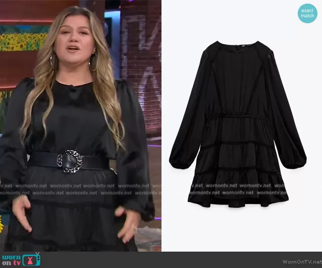 Kelly Clarkson on The Kelly Clarkson Show on NBC was spotted wearing this black satin mini dress on The Kelly Clarkson Show on Jan 06 2023's episode. Kelly's Dress is the Satin Effect Dress with Lace Inserts by Zara.