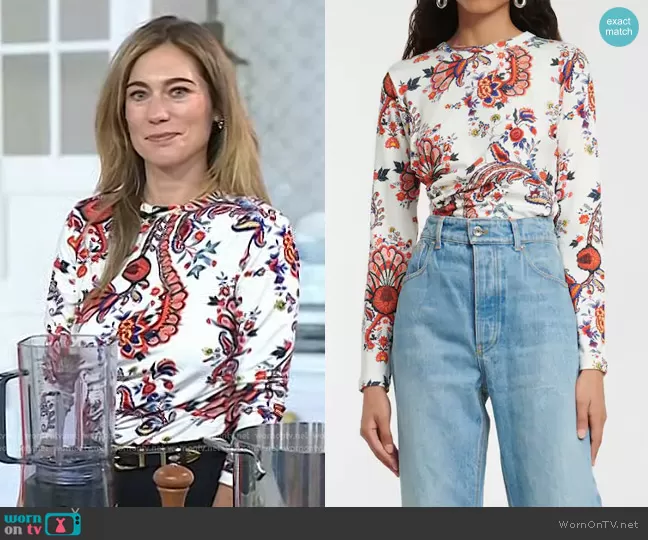on Today on NBC was spotted wearing this white floral top on Today on Jan 10 2023's episode. 's Top is the Ruched Floral Jersey Long-Sleeved Top by Paco Rabanne.