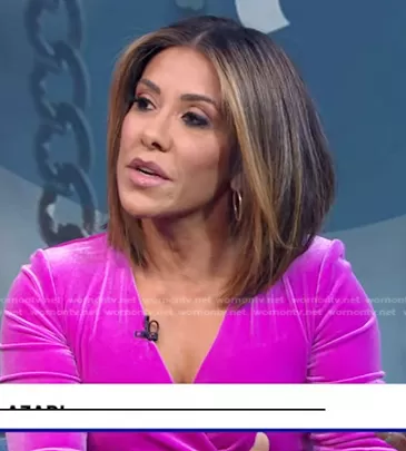 on Good Morning America on ABC was spotted wearing this pink velvet mini dress on Good Morning America on Jan 10 2023's episode. 's Dress is the Como Long Sleeve Faux Wrap Velvet Dress in Magenta Rose by Black Halo.