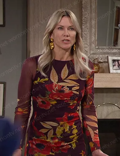 Kristen DiMera (played by Stacy Haiduk) on Days of our Lives on Peacock was spotted wearing this floral mesh dress on Days of our Lives on Jan 11 2023's episode. Kristen's Dress is the Floral Print Long Sleeve Midi Dress by Fuzzi . Kristen's Earrings is the Petals Earrings by Zara.