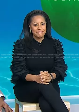 Sheinelle Jones on Today on NBC was spotted wearing this black fringed sleeve sweater on Today on Jan 11 2023's episode. Sheinelle's Sweater is the Fringe Trim Sweater by Sioni.