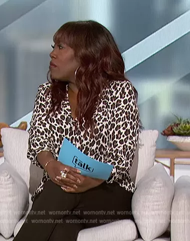 Sheryl Underwood on The Talk on CBS was spotted wearing this leopard print blouse on The Talk on Jan 11 2023's episode. Sheryl's Top is the Leopard V-Neck Top by Vince Camuto.