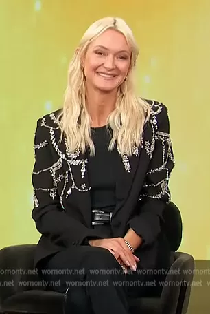 on Access Hollywood on NBC was spotted wearing this black embellished blazer on Access Hollywood on Jan 11 2023's episode. 's Blazer is the Clementine Embellished Crystal Peak Lapel Blazer by L'Agence.