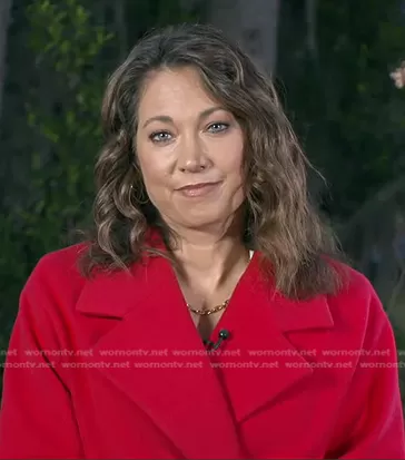 Ginger Zee on Good Morning America on ABC was spotted wearing this red wrap coat on Good Morning America on Jan 11 2023's episode.