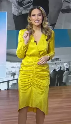 Rhiannon Ally on Good Morning America on ABC was spotted wearing this yellow ruched dress on Good Morning America on Jan 11 2023's episode. Rhiannon's Dress is the Ronnie Ruched Long Sleeve Midi Dress by Wayf.