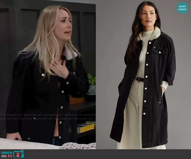 Josslyn Jacks (played by Eden McCoy) on General Hospital on ABC was spotted wearing this long black denim coat on General Hospital on Jan 11 2023's episode. Josslyn's Jacket is the Sherpa-Collar Denim Jacket by Pilcro at Anthropologie.