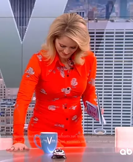 Sara Haines on The View on ABC was spotted wearing this orange floral ruched blouse on The View on Jan 12 2023's episode. Sara's Top is the Ruched Floral Print Mesh Shirt by Ganni.