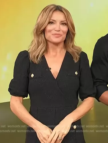Kit Hoover on Access Hollywood on NBC was spotted wearing this black v-neck button dress on Access Hollywood on Jan 12 2023's episode. Kit's Dress is the Riolette Tweed Minidress by Maje.