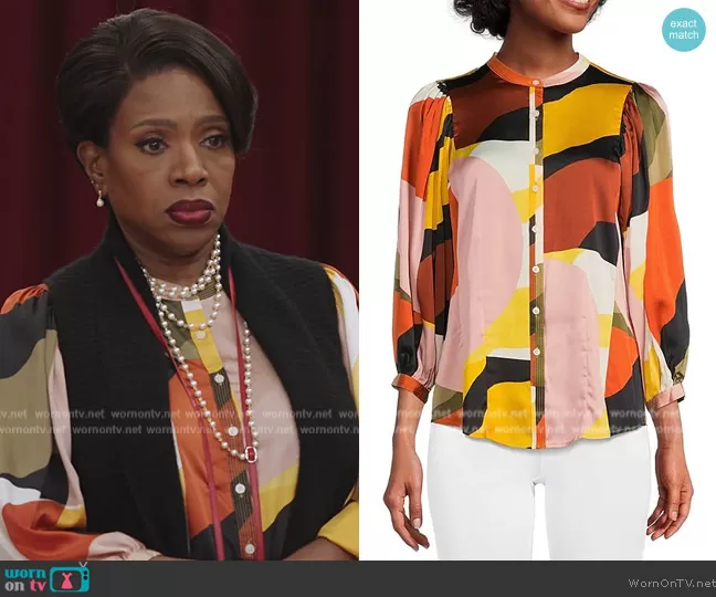 Barbara Howard (played by Sheryl Lee Ralph) on Abbott Elementary on ABC was spotted wearing this abstract print blouse on Abbott Elementary on episode 'Fight' (2x12) in Jan 2023. Barbara's Top is the 3/4 Blouson Sleeve Multicolor Printed Crew Neck Button Front Blouse by Karl Lagerfeld Paris.