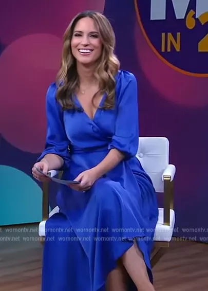 Rhiannon Ally on Good Morning America on ABC was spotted wearing this blue satin wrap dress on Good Morning America on Jan 13 2023's episode. Rhiannon's Dress is the 3/4-Sleeve Belted Faux-Wrap Gown by DKNY.