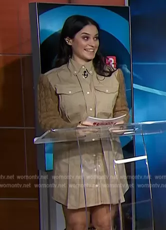 Donna Farizan on Today on NBC was spotted wearing this beige cable knit sleeve shirtdress on Today on Jan 13 2023's episode. Donna's Dress is the Vivian Mixed Media Shirt Dress by Derek Lam 10 Crosby.