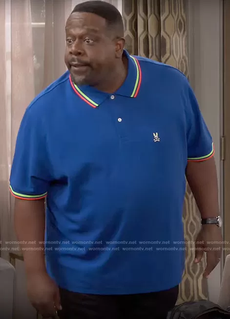 Calvin (played by Cedric The Entertainer) on The Neighborhood on CBS was spotted wearing this blue polo shirt with striped trim on The Neighborhood on episode 'Welcome to the Getaway' (5x10) in Jan 2023. Calvin's Shirt is the Lincoln Neon Tipped Polo by Psycho Bunny.