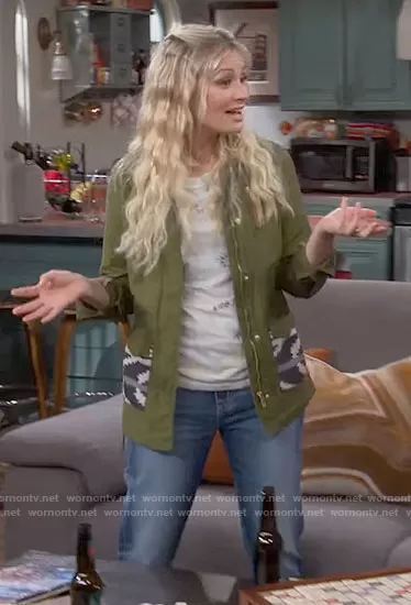 Gemma (played by Beth Behrs) on The Neighborhood on CBS was spotted wearing this green jacket with printed pockets on The Neighborhood on episode 'Welcome to New Beginnings' (5x14) in Feb 2023. Gemma's Jacket is the Embroidered Field Jacket by Scotch & Soda.