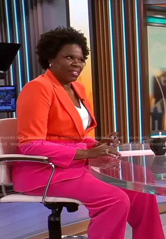 on CBS Mornings on CBS was spotted wearing this pink and orange suit on CBS Mornings on Jan 16 2023's episode. 's Jacket is the Colorblocked Boyfriend Blazer in Tomato Hot Pink by Tahari ASL . 's Pants is the Wide-Leg Pants in Hot Pink by Tahari ASL.