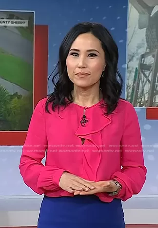 Vicky Nguyen on Today on NBC was spotted wearing this hot pink ruffle front top on Today on Jun 28 2024's episode. Vicky's Top is the Live Colorfully Blouse in Hot Pink by Kate Spade.