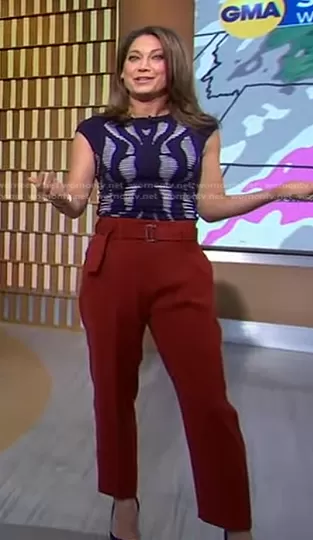 Ginger Zee on Good Morning America on ABC was spotted wearing this navy print top and brown belted pants on Good Morning America on Jan 16 2023's episode. Ginger's Sweater is the Short Sleeve Knit Sweater by Karen Millen . Ginger's Pants is the Cacey Pleated Front Trousers by Reiss.