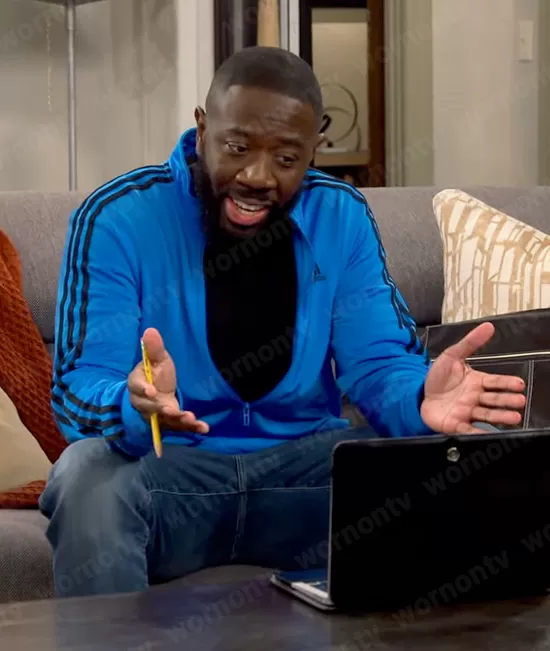 Malcom (played by Sheaun McKinney) on The Neighborhood on CBS was spotted wearing this blue Adidas jacket on The Neighborhood on episode 'Welcome to the Next Big Thing' (5x15) in Mar 2023. Malcolm's Jacket is the Essentials 3-Stripes Tricot Track Jacket in Team Royal Blue/Black by Adidas.