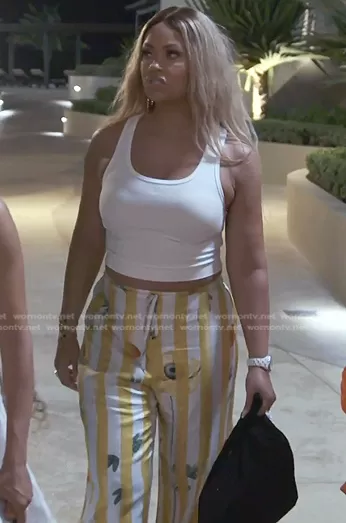Gizelle Bryant on The Real Housewives of Potomac on Bravo was spotted wearing this yellow striped pants on The Real Housewives of Potomac on episode 'Sisterhood of the Traveling Beefs' (7x13) in Jan 2023. Gizelle's Pants is the Striped Silk Twill Pajama Pants by Oscar de la Renta.