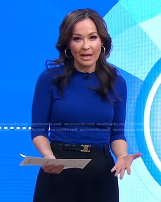 Eva Pilgrim on Good Morning America on ABC was spotted wearing this gold buckle belt on Good Morning America on Jan 17 2023's episode. Eva's Belt is the Medium Triomphe Belt in Smooth Calfskin by Celine.
