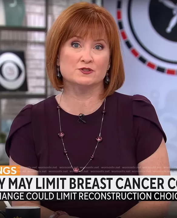 on CBS Mornings on CBS was spotted wearing this dark purple dress on CBS Mornings on Jan 17 2023's episode. 's Dress is the Tulip Sleeve Sheath in Aubergine by Calvin Klein .
