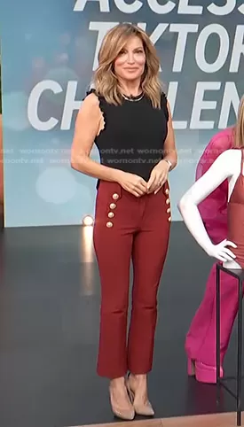 Kit Hoover on Access Hollywood on NBC was spotted wearing this black sleeveless knit top and red pants on Access Hollywood on Jan 17 2023's episode. Kit's Sweater is the Gardenia Cotton Blend Sweater Tank by Paige . Kit's Pants is the Robertson Crop Flare Pants by Derek Lam 10 Crosby.