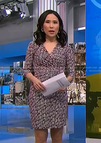 Vicky Nguyen on NBC News Daily on NBC was spotted wearing this red and white wrap dress on NBC News Daily on Jan 18 2023's episode. Vicky's Dress is the Faux Wrap 3/4 Sleeve Dress by Laundry by Design.