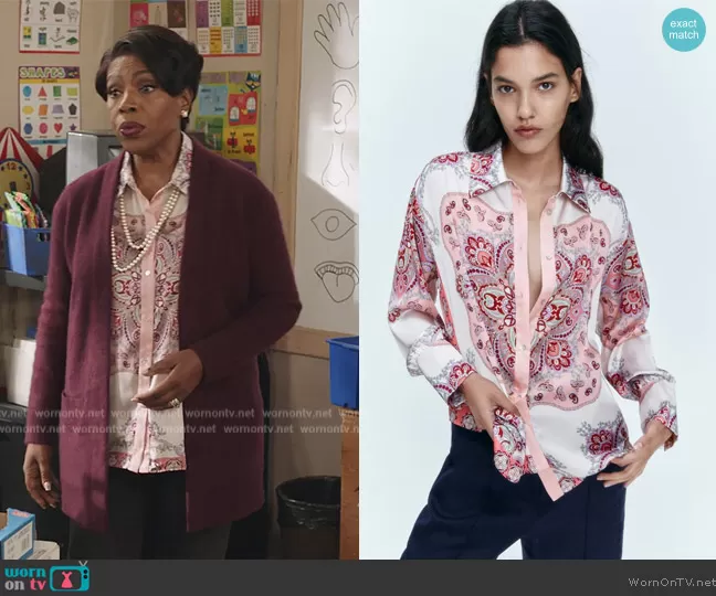 Barbara Howard (played by Sheryl Lee Ralph) on Abbott Elementary on ABC was spotted wearing this pink paisley print blouse on Abbott Elementary on episode 'Fundraiser' (2x13) in Jan 2023. Barbara's Top is the Flowy Printed Shirt by Zara.