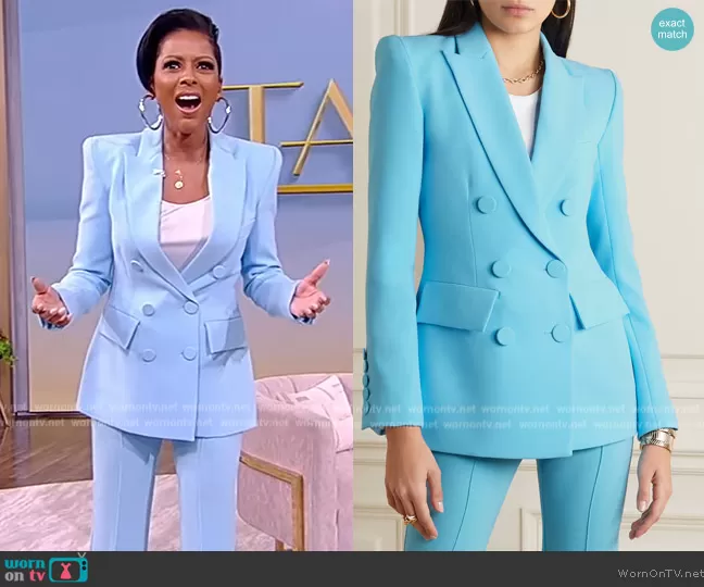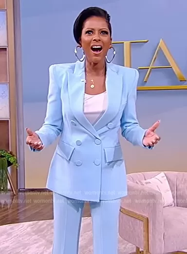 Tamron Hall on Tamron Hall Show on ABC was spotted wearing this blue double breasted blazer on Tamron Hall Show on Jan 19 2023's episode. Tamron's Blazer is the Landon double-breasted crepe blazer by Alex Perry . Tamron's Pants is the Aldrich crepe flared pants by Alex Perry.