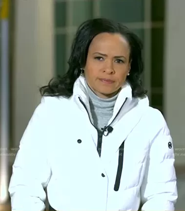 Linsey Davis on Good Morning America on ABC was spotted wearing this white puffer jacket on Good Morning America on Jan 19 2023's episode. Linsey's Jacket is the Removable Faux-Fur-Trim Hooded Puffer Coat by Michael Michael Kors.