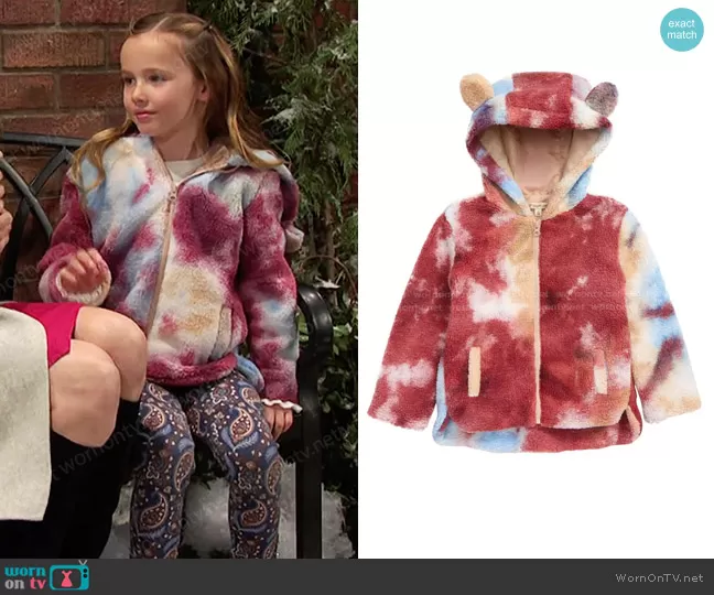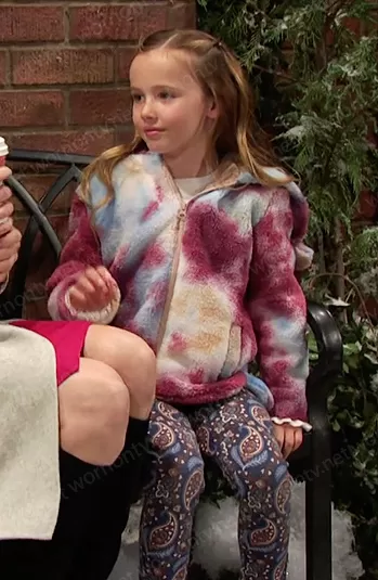 Rachel Black (played by Finley Rose Slater) on Days of our Lives on Peacock was spotted wearing this tie dye sherling jacket and paisley leggings on Days of our Lives on Jan 20 2023's episode. 's Jacket is the Kids' Faux Shearling Hooded Jacket by Tucker + Tate . 's Pants is the Paisley Button Cuff Ponte Pant by Janie and Jack.