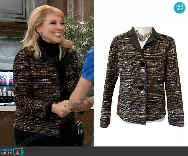 Liesl Obrecht (played by Kathleen Gati) on General Hospital on ABC was spotted wearing this tweed jacket on General Hospital on Oct 25 2023's episode. Liesl's Jacket is the Tweed Jacket by Lafayette 148 NY .