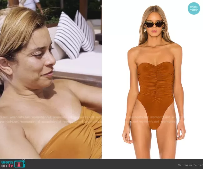Robyn Dixon on The Real Housewives of Potomac on Bravo was spotted wearing this brown ruched swimsuit on The Real Housewives of Potomac on episode 'Indecent Disclosure' (7x15) in Jan 2023. Robyn's Swimsuit is the Slinky Marissa One Piece by Norma Kamali.