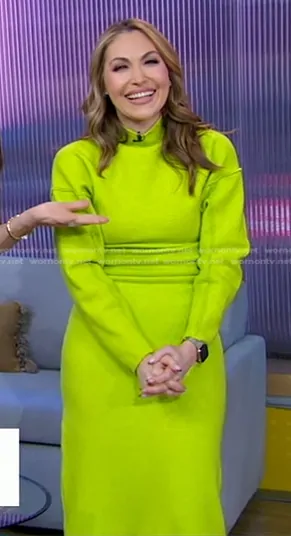 Lori Bergamotto on Good Morning America on ABC was spotted wearing this yellow sweater dress on Good Morning America on Mar 20 2024's episode. Lori's Dress is the Mock Neck Knit Dress by Zara.