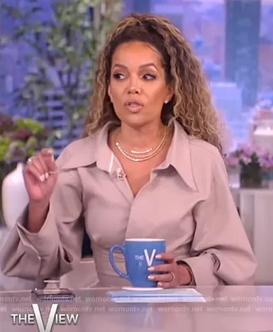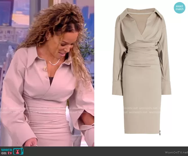 Sunny Hostin on The View on ABC was spotted wearing this gray surplice dress on The View on May 07 2023's episode. Sunny's Dress is the Indicate Cotton-Blend Midi Dress by Maticevski.