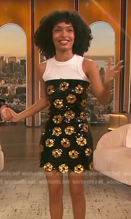 on The Drew Barrymore Show on CBS was spotted wearing this black floral sequin mini dress on The Drew Barrymore Show on Jan 23 2023's episode. 's Dress is the The Esme Sequin Mini Dress w/ Floral Details by Brandon Maxwell.