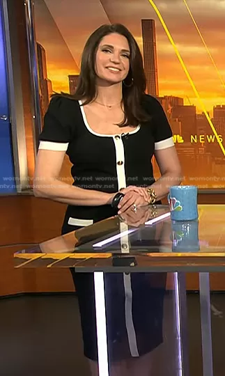 Maria Larosa on Today on NBC was spotted wearing this black contrast trim button dress on Today on Jan 23 2023's episode. Maria L's Dress is the Scoop Neck Puff Sleeve Button Tipped Midi Sweater Dress by Express.