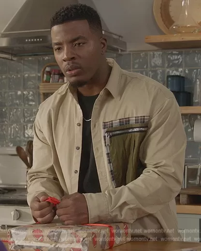 Spencer James (played by Daniel Ezra) on All American on CWTV was spotted wearing this khaki patchwork pocket jacket on All American on episode 'Feel So Good' (5x08) in Jan 2023. Spencer's Jacket is the Patch Drop Shirt by Dsquared2.