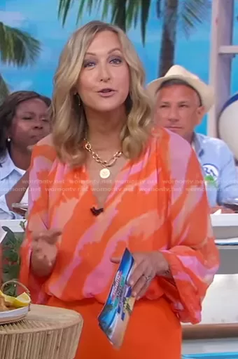 Lara Spencer on Good Morning America on ABC was spotted wearing this pink and orange printed blouse on Good Morning America on Aug 14 2024's episode. Lara's Top is the Raynn Top by Ramy Brook.