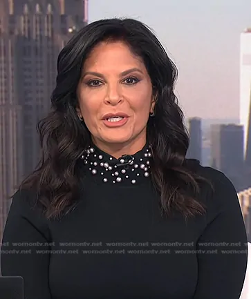 Darlene Rodriguez on Today on NBC was spotted wearing this black pearl embellished neck sweater on Today on Feb 21 2025's episode. Darlene's Sweater is the Faux Pearl Embellished Mock Neck Sweater by Eliza J.