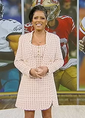Tamron Hall on Tamron Hall Show on ABC was spotted wearing this pink tweed check mini dress on Tamron Hall Show on Jan 24 2023's episode. Tamron's Dress is the Cotton-blend bouclé minidress by Giambattista Valli . Tamron's Sweater is the Cropped Double-Breasted Jacket by Giambattista Valli.
