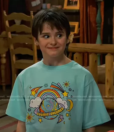 Winnie Webber (played by Shiloh Verrico) on Bunkd on Disney was spotted wearing this blue Cosmic Dreamer print tee on Bunkd on episode 'Wild West Side Story' (6x14) in Jan 2023. Winnie's Pajama Set is the Cosmic Dreamer Space Tee & Pants Pajama Set by Asos.