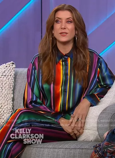 on The Kelly Clarkson Show on NBC was spotted wearing this multicolored satin stripe blouse and pants on The Kelly Clarkson Show on Jan 25 2023's episode. 's Top is the Simon Blouse by dMn Paris . 's Pants is the Hailey Multicoat Pants by dMn Paris.