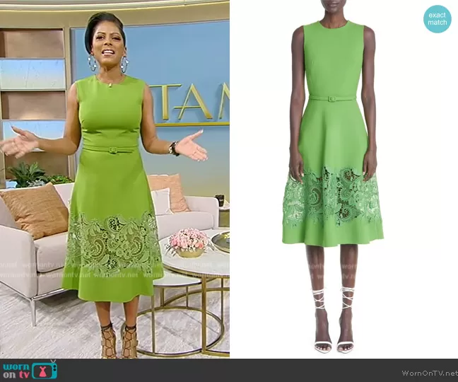 Tamron Hall on Tamron Hall Show on ABC was spotted wearing this green lace inset sleeveless dress on Tamron Hall Show on Jan 25 2023's episode. Tamron's Dress is the Belted Lace-Insert Midi-Dress by Oscar de la Renta . Tamron's Shoes is the Metallic Laminated Eel Lace-Up Sandal, Gold by Tom Ford.