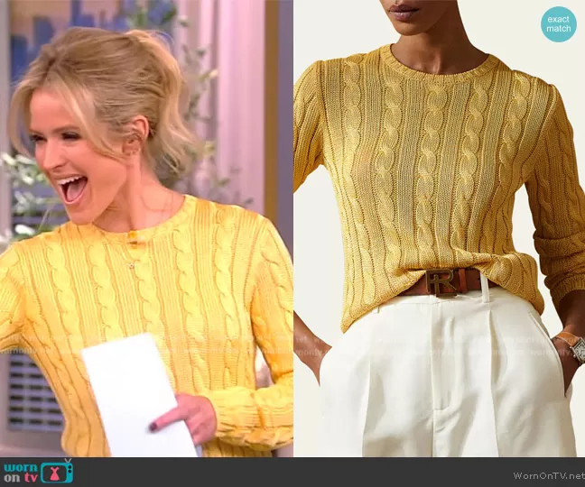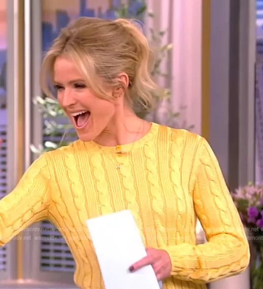 Sara Haines on The View on ABC was spotted wearing this yellow cable knit sweater on The View on Jan 25 2023's episode. Sara's Sweater is the Cable Wool Sweater by Ralph Lauren.