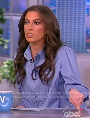 Alyssa Farah Griffin on The View on ABC was spotted wearing this blue button down blouse on The View on Jan 25 2023's episode. Alyssa's Top is the Cinema Stretch Cotton Crop Blouse by Maje.