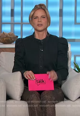 Natalie Morales on The Talk on CBS was spotted wearing this denim puff sleeve top on The Talk on Jan 25 2023's episode. Natalie's Top is the Frankie Denim Button-Down Shirt by Frame . Natalie's Pants is the Le Sylvie Coated High Waist Straight Leg Jeans by Frame.